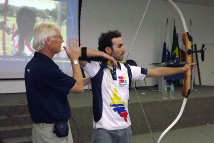 Richard PRIESTMAN (photo left), a former British Olympian medallist who has coached several countries, is currently preparing Brazil to the 2016 Olympic Games. He explained how he trained archers to cope with the wind and rain, including aiming off. The second part of Richard’s lecture was about his "bow training" programme made of a set of exercises with the bow, but few with an arrow. Most exercises use a harness on the string elbow, connected to the bow string either by an elastic or a rope, allowing dry fire.