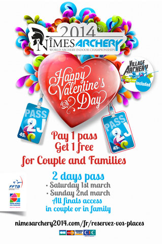In celebration of Saint Valentine, 2J tickets are currently buy one, get another free. The pass, which costs 45 euros, grants access to the standard spectator class areas of the venue to the archery village exhibition and finals on Saturday 1 and Sunday 2 March 2014.