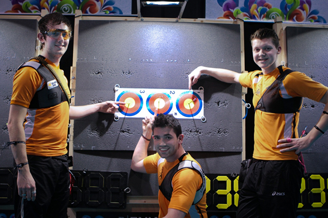 Dutch boys celebrate a shoot-off victory over France to put themselves into the recurve team semis.