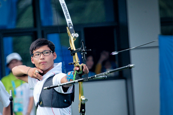 2) LEE Woo Seok of Korea dropped one arrow out of the 10-ring in his three-set win.