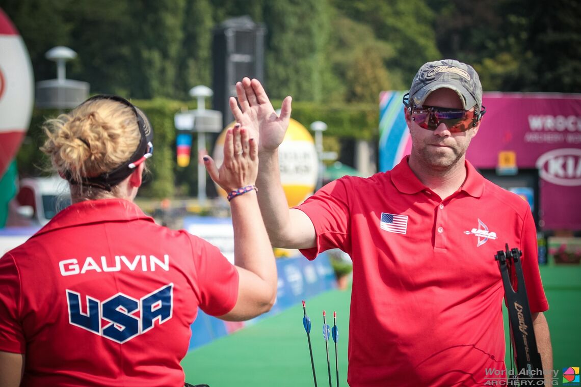 Heading in to the last, the match drawn at 115, both pairs started with a nine and a 10 – then Braden Gellenthien and Crystal Gauvin drilled two Xs. Colombia needed a perfect score from the last two arrows of the match to force a tiebreaker.