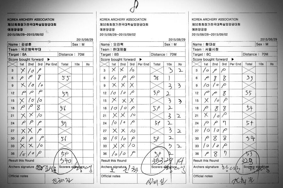 As part of a four-distance 1440 round in Yecheon, Korea for the 32nd Korea Archery Association President Flag Tour tournament at the end of August, Oh Jin Hyek scored 353 out of a possible 360 points for 36 arrows at 70 metres.