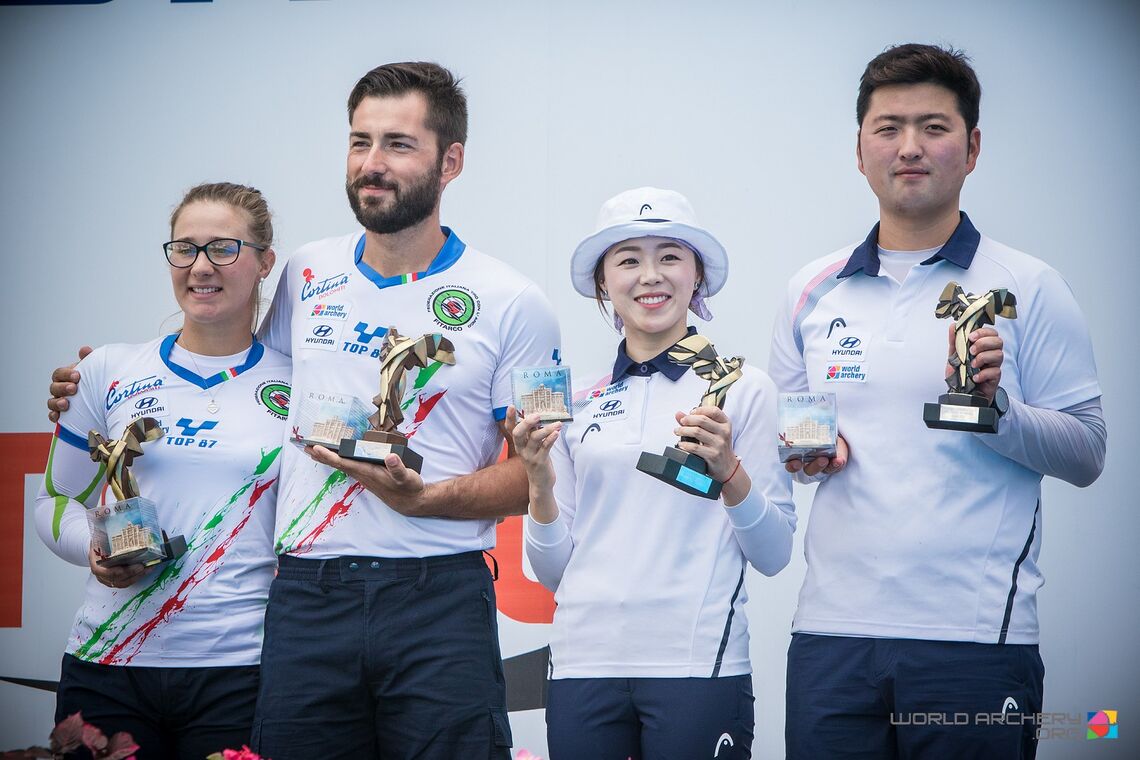 Korean pair Kim Woojin and Chang Hye Jin beat the hosts of the 2017 Hyundai Archery World Cup Final Italy, represented by Mauro Nespoli and Vanessa Landi, 5-1, to claim the mixed team title in Rome.