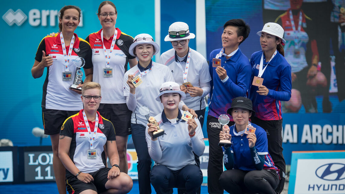The Korean women dispatched Germany in three sets, 5-1, despite not shooting to their normal level, after setting the world record in team qualifying earlier in Antalya.