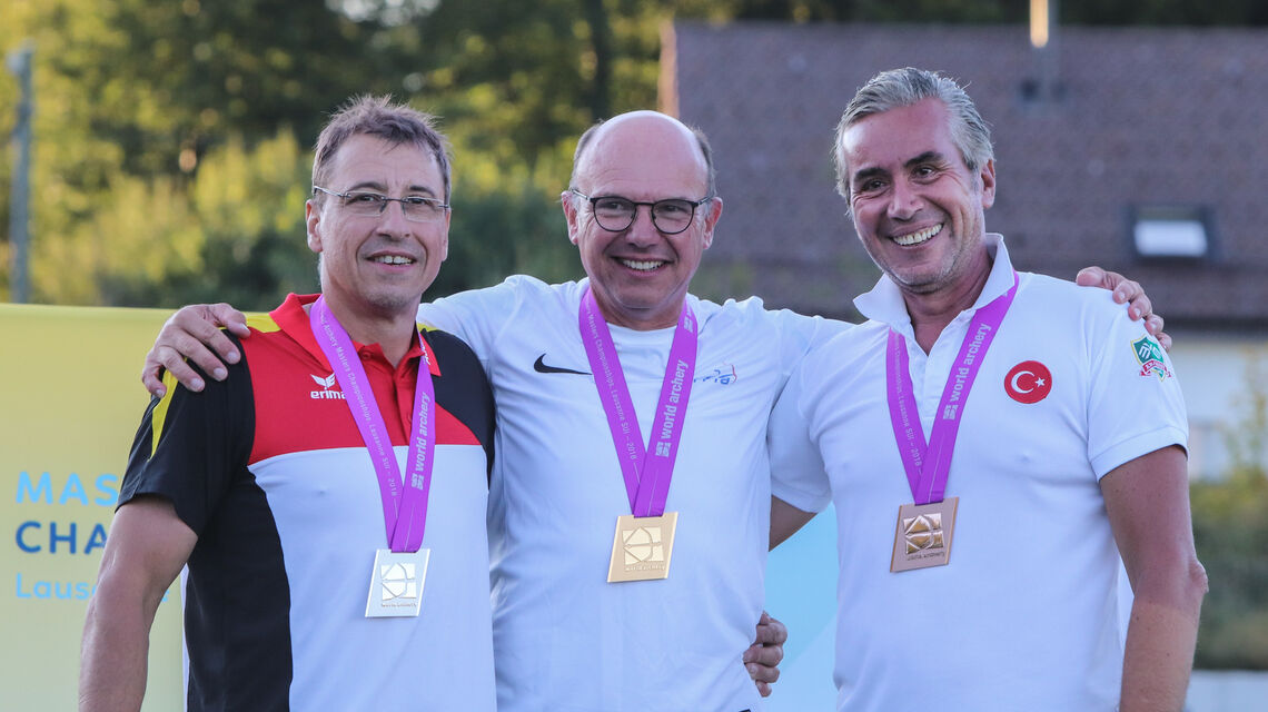 After a long day of competition spread over nearly 11 hours, the recurve men’s 50+ outdoor championship saw Eric Libert of France crowned World Archery Masters Champion in Lausanne, Switzerland. He beat Adolf Mohr of Germany 6-4 in the final, shooting ends of 28, 29, 28, 27, 28 to take the title.