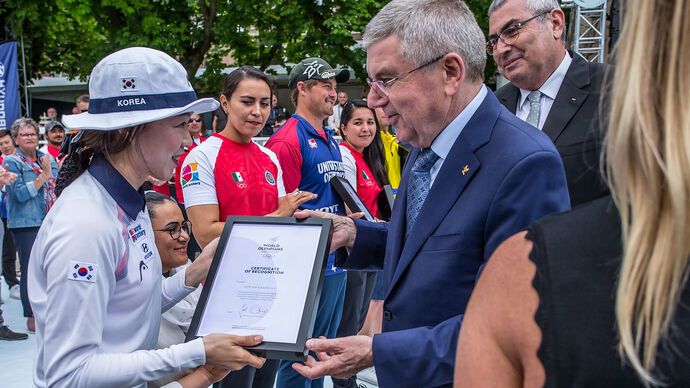 President Bach most recently visited an archery event during the 2019 Hyundai World Archery Championships in ’s-Hertogenbosch, where he presented OLY certificate and pins to Olympians competing in the tournament – and attending as spectators – among them was reigning Olympic Champion Chang Hye Jin.