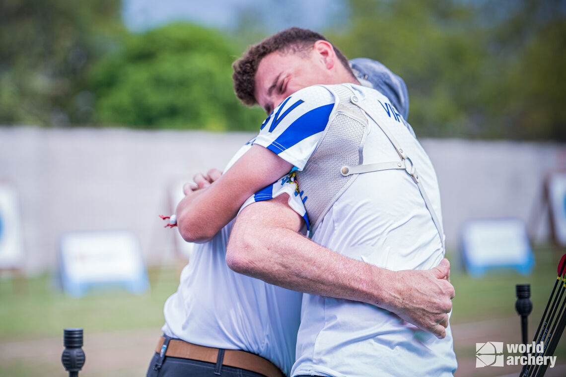 He hugged his father, his coach, waiting for his opponent’s arrow during the tiebreak.