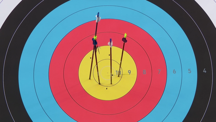 The chances of a Robin Hood even happening in a 70-metre recurve competition are extremely rare, especially as both archers were using Easton X10 arrows, which are ‘barrelled’ (the end is thinner than the centre). George Tekmitchov, the engineer who designed the X10, made a calculation that An San’s shot must have been no more than 0.2mm away from the dead centre of Kim Je Deok’s arrow – and almost perfectly aligned.