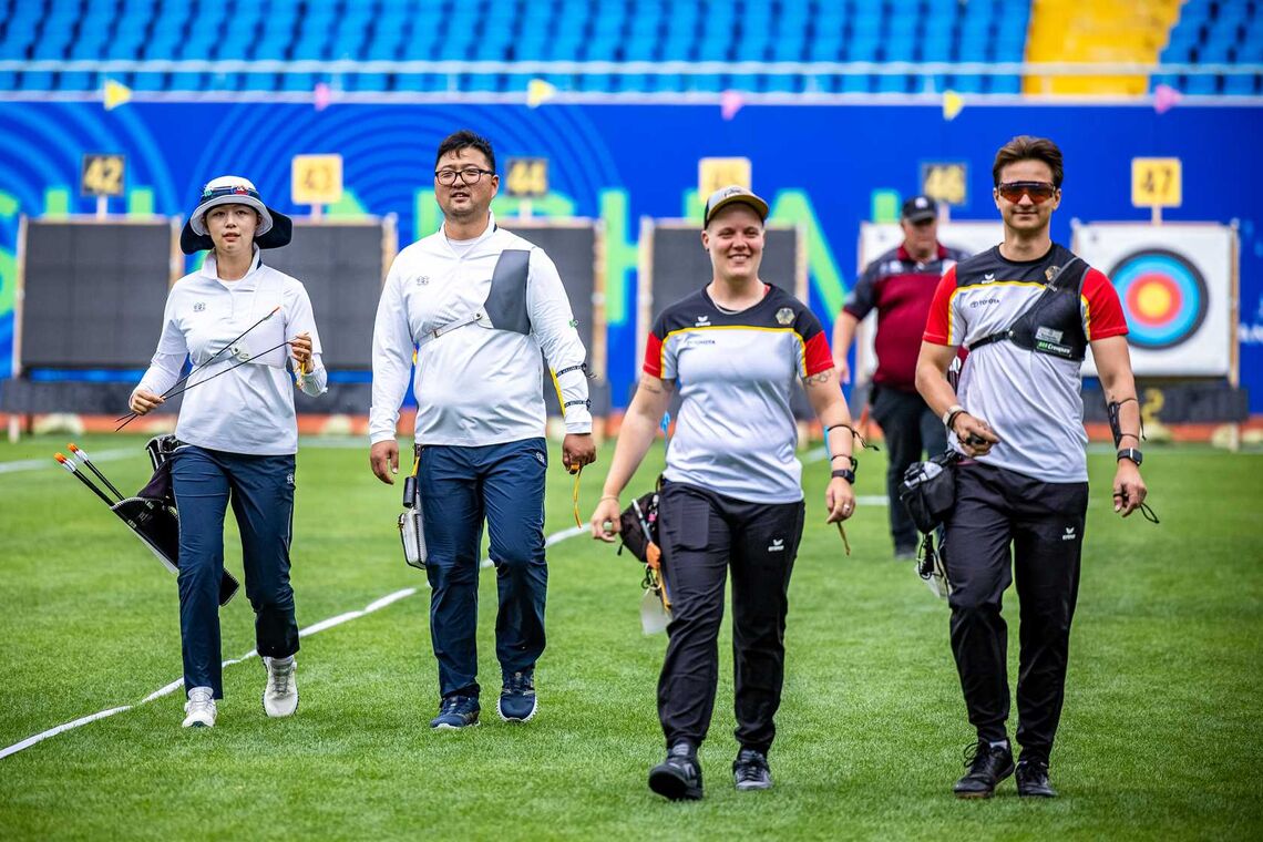 In a rematch of the Paris 2024 final – this time Michelle Kroppen partnering with Moritz Wieser instead of Florian Unruh – Germany took the first set, then drew the next two. Korea needed a perfect 40 to stay alive, and delivered.