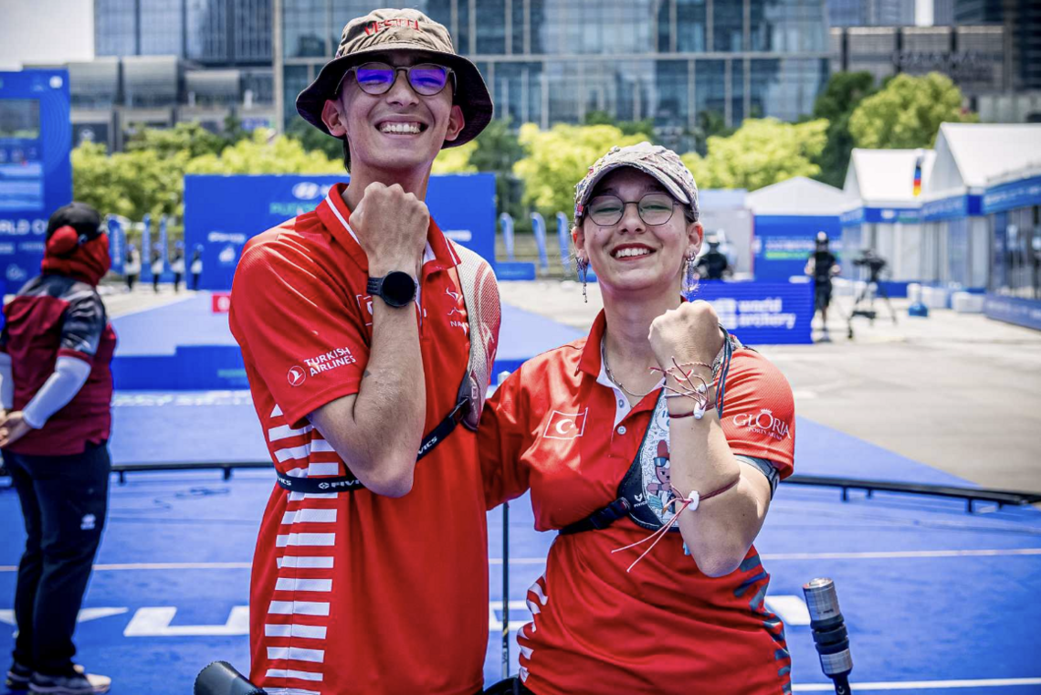 Mete Gazoz and Dunya Yenihayat celebrating their bronze medal win in mixed team.
