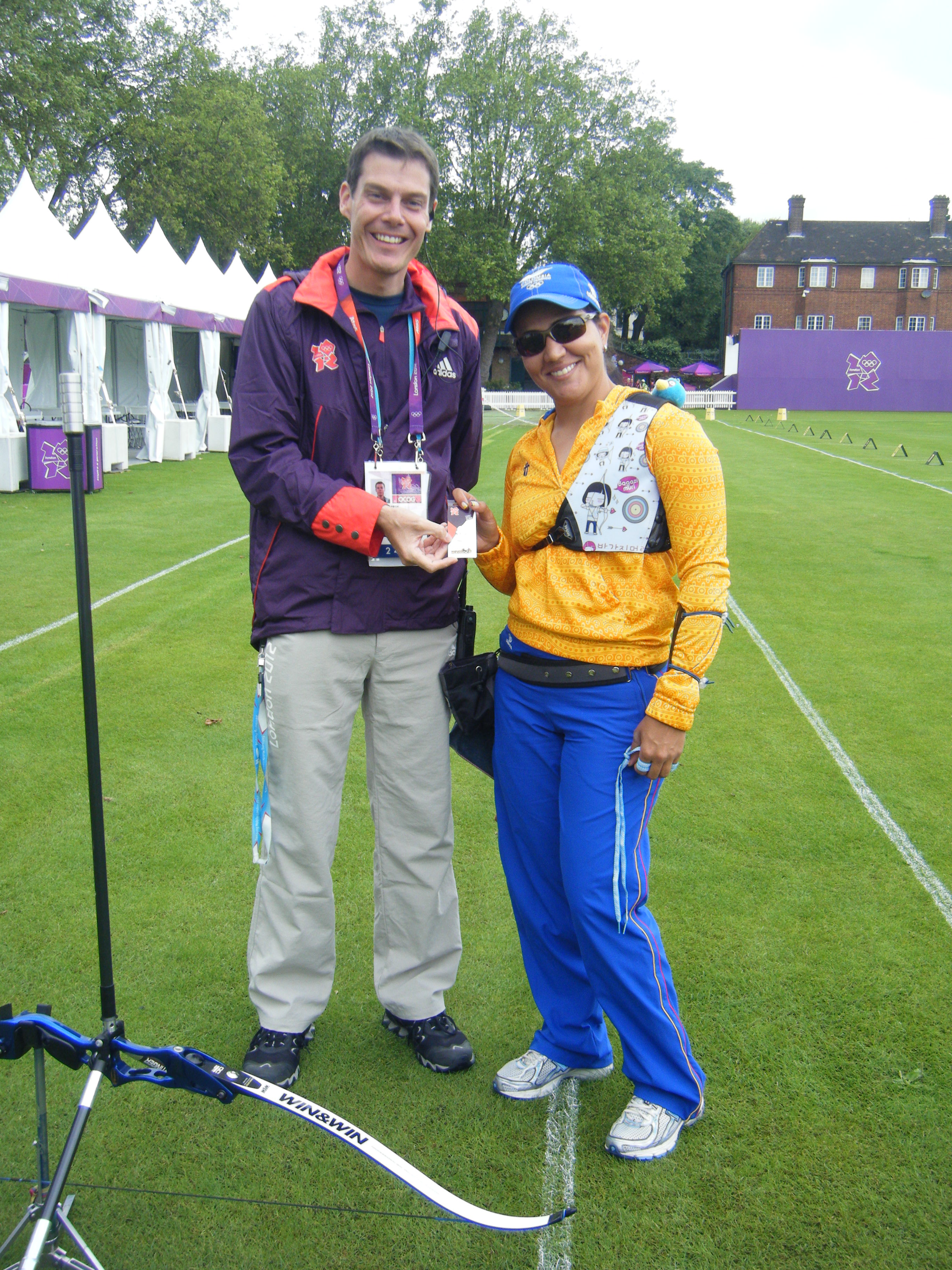 Archery teams have begun to arrive in London and make their way to the Olympic Village. Today, two Colombian archers were the first to experience the Olympic Archery Training/Ranking Round Range at Lord’s Cricket Ground in London. Ana RENDON and Daniel PINEDA OSORIO first warmed up on the 10m range and then shot on the 70m range. It was Ana RENDON who shot the first arrow at 70m and in recognition of this, Chris MARSH, Archery Competition Manager, presented her with a Wenlock Olympic mascot archery badge.