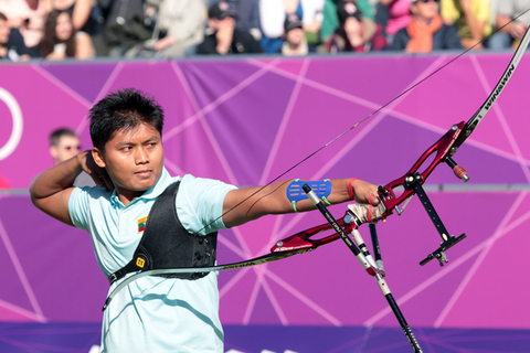 Myanmar's MYO AUNG upset the No. 9 seed GIROUILLE (FRA) in the first round. He now faces another higher ranked experienced archer. After IVASHKO clinched the first set 29-23, the two athletes were evenly matched in the following two sets.