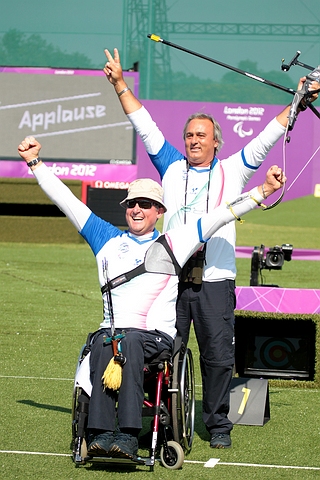 RANJBARKIVAJ started the fifth set with an 8. TSENG hit the bull’s eye (the very centre of the target!) to score a 10! The Iranian finished with 9 and 8. TSENG scored a perfect final set (10-10-10) to win the first medal of the archery competition at the London 2012 Paralympic Games! Flag bearer for Italy at the Opening Ceremony, individual bronze and team gold medallist in the Sydney 2000 Paralympic Games, sixth time Paralympian (1992 and 1996 in shooting and since 2000 in archery), winner of several medals at the world championships, DE PELLEGRIN had his chance to the “grail”: an individual Paralympic title! He shot the final against SANAWI. The Italian started the match like he had been waiting all his life for this moment: 10-10-10 and a 2-0 lead. DE PELLEGRIN also won the second set 26-22, 4-0! Two points away from gold! The third set was a bit hectic: 8-8-7 for SANAWI and 8-7-7 for DE PELLEGRIN. The Malaysian came back at 2-4. SANAWI found some rhythm in the fourth set scoring 10-9-9. The Italian has 8-10-9, tied match at 4-4! DE PELLEGRIN started the deciding set with a 9. SANAWI responded with a 9. The Italian had a 9. SANAWI a 10! DE PELLEGRIN finished with a 10! SANAWI needed a 10 to win gold—he scored a 9. Tied set, tied match, shoot-off! One arrow only for each archer, 20 seconds to shoot, and the closest to the centre wins the gold! DE PELLEGRIN scored a 9. SANAWI had an 8. DE PELLEGRIN is the new Paralympic champion! Recurve Men Standing Russian dual in the first semifinal in this category: the No. 9 seed Oleg SHESTAKOV (RUS) played against Mikhail OYUN (RUS). SHESTAKOV took a 4-0 lead in set points, but he shot a “Miss” in the third set, allowing OYUN to come at 2-4. OYUN scored 9-9-8 in the fourth, while SHESTAKOV had 9-8-9*. Would the 9* become a 10? Yes, said the judge (the arrow just touched the line) and SHESTAKOV won it 6-2! In the second semifinal, a third Russian, the No. 2 seed Timur TUCHINOV, was against the one-armed archer and No. 11 seed Eric BENNETT (USA). The athletes traded the first two sets, 2-2. The athletes kept it close in the third set until BENNETT finished with a 4. TUCHINOV took a 4-2 lead. BENNETT needed to put pressure when he started the fourth set, but he scored 7-7. TUCHINOV built a lead with 9-8. BENNETT finished courageously with a 9, but TUCHNIOV did not miss his opportunity. A final 9 got him a place in the gold medal match against his teammate SHESTAKOV.