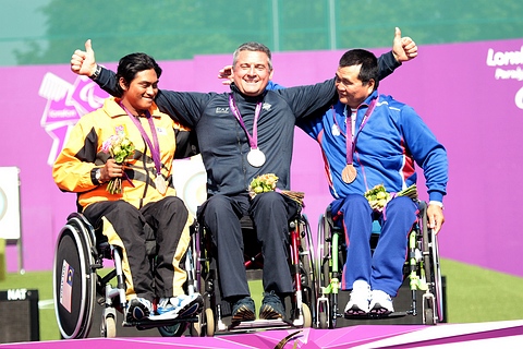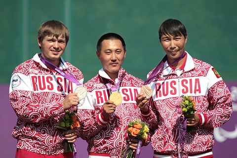 The Italian Oscar DE PELLEGRIN crowned a magnificent career with an individual Paralympic title in Recurve Men W1/W2. Russia got a full house on the podium in Recurve Men Standing! The medal matches at the archery competition of the London 2012 Paralympic Games started today! The four men’s categories were in action, beginning with the W1/W2 and Standing categories in the morning. The athletes shoot their semifinals and then either the bronze or gold medal matches. Every individual archery match at the London 2012 Paralympic Games is the best of 5 sets of 3 arrows. There are 2 points per set to be earned. The first archer to 6 six set points wins the match! If the regulation number of sets (5) ends at 5-5 set points, there is a one-arrow only shoot-off, closest to centre wins! Here some commentaries from the field! Recurve Men W1/W2 It was the first match of the day between the No. 1 seed TSENG Lung Hui (TPE) and the No. 4 seed Oscar DE PELLEGRIN (ITA). A lot of 9s were shot in the first two sets of this match. TSENG went out of the 9-ring twice and DE PELLEGRIN only once, thus taking the advantage 3-1 in set points. DE PELLEGRIN seemed to have taken a strong lead, when he shot the first 10 of the match in the third set. However, he finished it with an 8. TSENG took the opportunity by scoring a 10 of his own and tied the match at 3-3 in set points. TSENG scored 9-7-9 in the fourth set, but the DE PELLEGRIN was slightly better with 9-8-9. He regained the lead, 5-3. TSENG needed to put pressure in the fifth set. He started with a 9. DE PELLEGRIN scored an 8. TSENG had another 9. DE PELLEGRIN a 9. TSENG finished with an 8. The Italian had the opportunity to win the match with a final 9. He scored a 10! Finally, the battle between the Paralympic record holder and the world record holder turned in favour of DE PELLEGRIN who booked his place in the gold medal match! The second semifinal was between the No. 2 seed Ebrahim RANJBARKIVAJ (IRI) and the surprising No. 19 Hasihin SANAWI (MAS). They shared the points of the first set with 24-24. Both archers raised their game in the second set. The Iranian had 9-10-8, but the Malaysian scored a perfect 10-10-10 to take a 3-1 lead. However, RANJBARKIVAJ (IRI) was more consistent in the third and fourth set. He won them 26-23 and 26-24 to turn the situation over and take a 5-3 lead. In the fifth set, SANAWI scored 8-10-10. RANJBARKIVAJ started it with 9-10 and needed a 10 to win. He was unable to get it (scoring a 7) and SANAWI tied the match at 5-5! Shoot-off! RANJBARKIVAJ shot first: an 8. SANAWI scored a 10 and upset the No. 2 seed! The No. 1 and No. 2 seeds had to play for bronze! TSENG took the best start winning the first two sets 26-25 and 29-28. RANJBARKIVAJ came back “halfway” by winning the third set 28–26. The Iranian needed to put pressure in the fourth set but he only scored 9-9-8. TSENG started with 8-10 and needed a 9 to win! He scored an 8. Tied set and TSENG led 5-3.