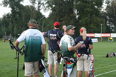 At the bottom half of the draw, the No. 6 seed South Africa had a good run. MARX/COETZEE first beat Ukraine 147-140 and then the No. 3 seed Italy 149-148. Then the South Africans actually turned it up another notch against the USA. They led 39-37, 78-77 and 116-115. In the last end ABERNETHY/NICELY just managed to tie the match at 153-153! In the shoot-off, both teams scored 18 points, but the Americans had the closest arrow to the centre!