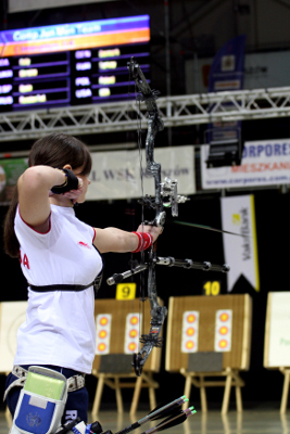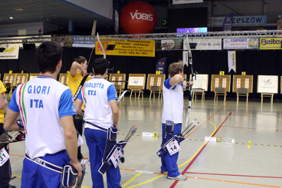 The team event of the Indoor World Championships Rzeszow 2009 started on Saturday morning 7 March with the junior class. The team matches were shot until the semi-finals and the finals will take place on Sunday morning. In the recurve junior men’s category, two teams beat the 24-arrow world record with 234 points. Turkey and Italy have become co-world record holder. The senior teams will venture onto the field in the afternoon.  Recurve Junior Men The Turkish team set the tone in the first round of the morning with a new world record at 234 points for the 24-arrow team match. Seeded no. 7, the young BOZLAR, CINAR and YILMAZ beat the Americans (no. 10) to face one of the favourite teams, Italy photo in the quarterfinal. Setting a new world record was probably too much emotion for the young Turks who completely missed the point in their second match scoring only 213 points. Seeded no. 2, the Italians GIORI, MELOTTO and PAOLETTA proved they were to be reckoned with also shooting 234 and becoming co-world record holders.   “It was hard! They came from a new world record and we were from a bye. We trusted in ourselves and we started the match. I don’t know what happened to them, but we didn’t lose our concentration and we equaled their record,” Lorenzo GIORI (ITA) said.   In the semi-final, Italy faced the no. 3 seed Chinese Taipei. In a close match between two of the favourite teams, KAO, PENG and YU finally took over their opponents from Europe. The second semi-final match was between Ukraine (no. 1) and Germany (5). The young IVANYTSKYY, KOMONYUK and MARCHENKO proved too strong for their German contenders, MAYR, NESEMANN and WACHSMUTH. After already shooting the good score of 232 in the previous round against Russia, the Ukrainians put it off against the Germans 232-215.   On Sunday morning, Ukraine will face Chinese Taipei for gold, while Germany and Italy will fight for bronze.   Recurve Junior Women In this category, the top 4 teams—Ukraine, Russia, Chinese Taipei and Poland—qualified for the semi-finals, but then surprise came from the local team Poland. In an extremely tight match against Ukraine, the young BARAKONSKA, KAMINSKA and WYCZECHOWSKA managed to keep a small 1-point lead after their 24 arrows to win 225-224.   “I don't know what I can say... It's a too big emotion for me... Me and my teammates will be shooting for the gold medal in front of our public, in our arena, here in Poland. Really unbelievable”, Milena BARAKONSKA (POL) declared after winning the semi-final.   The Polish youngsters will have the Russians as opponents on Sunday morning. BOMBOEVA, DOBYCHINA and SEGINA first defeated Italy (227-220) and then Chinese Taipei (228-225). They will start as the favourites in the gold final, as they are the no. 2 seeded, but the Poles will be cheered up by their fans and might create another upset to win the world title. Answer to be given tomorrow!   The bronze medal will be played out between no. 1 seed Ukraine and no. 3 Chinese Taipei.  Compound Junior Men The top 2 seeds—Italy and USA—qualified for the gold final to be shot on Sunday morning. Italy first took out no. 8 Ukraine 230-218 and then no. 5 Spain 235-227. With this score of 235 points, they came very close to the world record held by Switzerland with 236. They even could have beaten it with a perfect last 60-points end.   “In the last end, we had to shoot a perfect 60 to beat the world record. Unfortunately, my first arrow was a 9 so we went on shooting in the 'easy way'”, Luca FANTI (ITA) said.   The USA team also scored 235 points in their first match versus no. 7 Poland to win 235-220. In the semi-final, ABERNETHY, CLELAND and SCHAFF—new 12-arrow match world record from yesterday with 120 points—defeated the no. 6 seeded team, Turkey.   While the world championship’s title will be decided between Italy and USA, Spain and Turkey will battle for the bronze medal.   Compound Junior Women With only five teams and Ukraine’s withdrawal from the first round, the compound junior women’s teams directly shot the semi-finals. The no. 1 seed USA shot against no. 4 Poland and faced no real opposition to win 228-213. The no. 2 team Russia shot against no. 3 Italy and won 228-222.   The US team of LANCE, NICELY and PRUITTE will shoot for gold on Sunday morning against the Russian team photo made up of ARTEMOVA, CHERKASHNEVA and KOROBEYNIKOVA, after Poland and Italy have decided on which team will take the bronze medal home.   FITA Communication