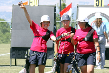 Team USA broke the compound cadet women’s world record and Russia the one in recurve cadet women. In recurve, Korea reached four gold finals. In the compound division, Mexico and the USA confirm their leading position by qualifying three teams each for a gold medal match.   There are three archers per team. Each squad shoots 4x6 arrows. Juniors have targets at 70 metres and cadets at 60 metres.   Recurve Junior Men Three upsets took place in the 1/8 elimination round. The No. 12 USA took out the No. 5 Italy! The Italians started best, but the USA came back to lead 155-153 and clinched the match 211-206. No. 13 seed Poland dominated No. 4 China, 53-47, 160-149, 214-201. Finally No. 11 Chinese Taipei beat No. 6 Australia in a close match, 212-211!   In the quarterfinal, Mexico put up a good fight against Korea. The Mexicans score a good 220 points (109 at the half), but the Koreans prevailed at the end with 226. The closest match was Poland-USA. The Polish built a 2-point lead at the half, 109-107. It was tough but they preserved it, 163-162, 216-214. Ukraine beat Chinese Taipei 211-204, while Great Britain took on India, 221-215.   In the semifinal, Ukraine took the lead over Great Britain in the first end 55-52. However a poor second end (46 points) put the Ukrainians in a hole. The British did not miss the opportunity to reach a gold medal match and took the match 108-101, 158-155, 216-204. Korea beat Poland in the second semifinal.   Recurve Junior Women There were two upsets in the 1/8 elimination round. No. 11 Kazakhstan beat No. 6 Chinese Taipei, 145-143 and then 199-191. On a smaller scale, No. 9 Japan eliminated No. 8 Russia, 154-144, 205-192.   Kazakhstan kept going strongly at the beginning of the quarterfinal. They led Ukraine 51-49. They were still neck-to-neck at the half (101-102), but then Ukraine made the difference in the third end. The Ukrainians took the lead at 156-146 and clinched the match 211-199. Netherlands and Poland were tied at 49-49 after the first end, but the Polish took the lead later on and won 206-198. Korea and China also moved on to the next round.  Ukraine and China (photo) were tied at 51-51 after the first end. However, China then took control: 106-104, 162-152 and 214-208. In the other semifinal Korea beat Poland again (as in the men’s competition), 222-191. The final will be a repeat of the last Olympic Games: Korea – China!   Compound Junior Men In the 1/8 elimination round, Australia beat the Russian Federation and Belgium claimed victory over India. The other countries had a bye into the next round.   As expected, the USA qualified for the semifinals by defeating Australia 114-108, 171-164, 228-219. Mexico easily prevailed over Belgium 232-217 and Denmark qualified over Sweden. Canada and Italy competed in a close match that ended in a tie, 112-112, 165-169, 223-223. The Canadians were better in the shoot-off to win 28-27.   In the semifinals, the USA built a 7-point advantage over Denmark in the first end. The Americans claimed an easy victory, 116-109, 173-166, 232-223. Mexico beat Canada 114-111, 173-166, 230-223. Mexico and the USA will fight for gold in the final.   Compound Junior Women In this category, the USA, Mexico and the Russian Federation advanced automatically to the semifinals, while India and Italy had to fight for a place in the next round. The Italian girls trailed 159-162 after two ends but came back strongly to win 217-212!   As expected the USA, the No. 1 team from qualifications, gained an easy win over Italy, 115-102, 170-156, 224-209. It was a tighter match between Mexico and Russia. The Mexicans had the best start, leading 56-53, 109-107, but the Russians came back strongly in the third end to take the lead (163-161). Russia won 219-214.   Recurve Cadet Men Turkey created the surprise of the first round. They beat Spain 213-197. Mexico also beat No. 5 Slovenia 214-205.   In quarterfinal Korea tied the world record with 229 points to defeat the USA! Russia and Italy had an intense match. The Russians led 109-107 and then 162-161. However the Italians pulled a 1-point comeback victory in the last end, 216-215! India and Ukraine also won.   Korean and India were tied after the first end of the semifinal, 53-53. That did not last long. The powerhouse Korean turned it on and won 110-103, 166-155 and 224-209. Italy led Ukraine 55-53. However the Ukrainians turned it around: 111-107, 166-162 and 223-215.  Recurve Cadet Women The only little surprise in the first round was No. 9 Mexico beating No. 8 Japan, 157-150, 209-203.   The four favourites prevailed in the quarterfinals: Korea, Turkey, Russia and Ukraine.   Russia (photo) shot really well in their semifinal. They held a commanding lead at the half 114-101. They kept going and broke the world record with 225 points! Korea performed almost as well! The Koreans shot 224 points to beat Turkey.   Compound Cadet Men In the 1/8 elimination round, South Africa defeated Great Britain and Mexico qualified over Venezuela, while all the other teams had a bye.   Two of the favourite teams did not survive the quarterfinals! In a very exciting match, No. 2 seed Denmark lost to No. 7 Mexico, 111-115, 166-165, 224-233. The Russians, seeded No. 3 after qualifications, had a bad start and were eliminated in their first round by India, 107-112, 165-166, 221-223. In the other matches, Australia defeated Canada 228-223, and the USA beat South Africa 230-227.    Surprisingly, the United States, the best team from qualifications, was eliminated by No. 9 Australia! The USA suffered after a weak performance in the first end. They couldn’t recover from their bad start and lost the match 53-58, 110-114, 165-173, 220-228. India trailed Mexico throughout the other semifinal, 57-58, 113-114, 167-171, and lost by 1 point, 226-227. Mexico and Australia advanced to the gold-medal match.   Compound Cadet Women The top-3 teams from qualifications (the USA, Russia and Mexic