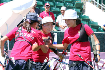 In the team shoot-off (one arrow per team member), Russia started well with 10-9 but finished with 7. Korea did not miss the opportunity. They scored three solid 9s to keep their world title!