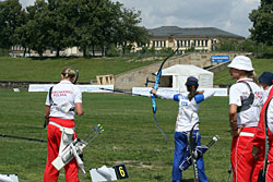 Italy suffered up to the very last arrow in this very important match qualifier for the Olympics… The two teams were tied after the first end at 55 points each. Italy then took a 2-point advantage on the score of 107-105. Taking advantage of a 3 shot by USA with their last arrow in the third end, the Italian ladies increased their lead to ten points with 6 arrows to go (155-145). The last arrows of the match were nerve-racking for the Italian fans, as their team’s last arrow was a 4… But finally, their advantage proved enough and they clinched the match and three Olympic spots by 203-198. 1/8 final: DPR Korea (13) – Great Britain (4)  The match between DPR Korea and Great Britain led to an unexpected shoot-off. The afternoon started in a bad way for the British ladies who were behind 96-101 and then 146-150. They came back to tie the match at 197 after the 24 regular arrows. Tied again after the first additional arrow (7-7), the two teams were staying very close to one another. The second shoot-off arrow was certainly the decisive one, as Ri and Williamson both shot an arrow that was close to the 8 line… However, the British arrow was touching it (8 points), while the one of DPR Korea was just out (7 points). Great Britain had thus a 1-point advantage at that time. With their third additional arrow, Kwon shot a perfect 10, whereas Burgess scored a 9, and the two teams were tied again! This meant three additional arrows, which the two teams started with a 9 and an 8. The last arrow was this time decisive with Burgess saving her country with a 10 against a 9 for the opponent. Three Olympic places also for the British!     1/8 final: Russia (5) - India (12)  Another great upset for the Russians today after they also lost in the Compound division this morning. Seeded no. 5 Russia was facing no. 12 seed India in this first round. Their first end was very low with 10-9-9-8-7-6 (49) versus India’s 10-9-9-9-7-7 (51). The Indians increased their advantage to four points half-way (104-100). The difference between the two teams kept increasing up to the end of the match (157-150) to finish at 206-198. The Russians are already out and India goes on to the quarter-finals, ensuring three Olympic places on the way.   1/8 final: France (9) - Japan (8)  France seemed to have a hard match ahead facing Japan in this round. However, the Japanese were just overwhelmed right away from the beginning, being already seven points behind after 6 arrows (54-47). They could never recover and had to leave victory to their French opponents by 205-193. Also France will go to the Olympics next year.     Teams qualified for the Olympics The eight winners of the 1/8 finals have secured three Olympic places each. They are: Korea, France, India, Great Britain, Poland, Italy, Chinese Taipei and China. As the latter is also the host country of the 2008 Olympic Games, they automatically have three spots. This means that the team ranked 9th takes the 8th spot for the Olympics. The lucky loser is Colombia with 205 points!   1/4 final: Chinese Taipei (7) - China (2)  After upsetting Kazakhstan in the 1/8 final (211-195), China had a very bad match versus Chinese Taipei in quarter-final. They started the match with a low 50-point end, leaving the lead to their opponents who shot 54. The difference between the two teams did not change much in the next two series (100-96 and 147-142). As Chinese Taipei seemed to hold victory, the first archer on the field just missed his shot completely, scoring a poor 3… This gave a chance for China to recover, but finally Chinese Taipei managed to keep a 2-point victory at the end (194-192).     1/4 final: Poland (3) - Italy (6) Strange match between these two countries… Poland took the lead early by 53-50 and increased its advantage up to 105-96 half-way. The third end gave rise to a strange situation in the Italian team: Valeeva, shooting first, released an 8, but as she was preparing to shoot her second arrow, she was not feeling all right with this one and turned to her team-mate Tonetta. The latter thus shot her two arrows and scored 7-9. Valeeva then took the shooting line again and released a 3 (!). Thanks to the third Italian, Lionetti, the team did not sink completely, as she scored X10-9. Intermediate score: 146-142. Italy did better in the next end and managed to tie its opponent at 197 points. In the shoot-off the Polish Mospinek started with a poor 5, leaving the door open… Italy rushed into and won this tie-break.   1/4 final: Korea (1) - France (9)  The favourite team Korea proved too strong for France in this round. The Koreans were already leading by 24 points (!) half-way, after one of the French ladies shot a 2 in the second end (159-135). There was no way France could recover for such a disadvantage and Korea clinched this duel by 210-188.     1/4 final: India (12) – Great Britain (4)  After giving themselves cold sweats in the previous round, Great Britain regained its self-control and carried out a strong second match. The British were comfortably leading their opponent good score of 210 points and qualified for the semi-finals to be shot on Saturday.   RECURVE MEN 1/8 final: Italy (seed 3)  - India (seed 14)
