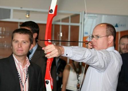 H. S. H. Prince Albert II of Monaco made a courtesy visit at the FITA stand in Sportel Monaco. The Prince Albert received a short archery introduction from Sébastien Flute, Individual Olympic Champion in 1992, before shooting a few arrows at a target, hitting the gold.
