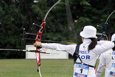 In the semi-finals Valeeva and Erdinyeva were tied at a low 52 points after 6 arrows. Erdinyeva raised her level to shoot 29 in the third end and could keep her lead until the end to finish on a 107-105 victory. Choi Eun Youn was facing her team-mate and 2005 World Champion Lee Sun Jin in the other semi-final. Lee took a three points advantage after 6 arrows but blew it up when she shot a 7 in the third end. The two fellow countrywomen were tied at 83 and also at the end of the match, both with 110 points. So a shoot-off was necessary. Choi achieved 10 with her first additional arrows, while Lee scored only a 9. Choi will play Erdinyeva in the final Saturday.