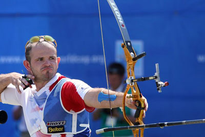 "Time has really flown by since we were first handed the honour of hosting this major event, and after so much hard work by so many people it is so exciting that we are almost at the finishing line," said Lynne Evans, chair of the GNAS, British archery's governing body. "It is going to be wonderful for our archers to be competing at the highest level in their own country, which is a great incentive for them to do well. We are also all looking forward to welcoming friends from home and abroad, and to having the opportunity to introducing many people to our wonderful sport. "Kent County Council, the people of Dover, SEEDA (South East England Development Agency), and UK Sport have been so supportive in the countdown to this event, and it is not just going to be an archery tournament, but a great event for everyone to join in, with lots going on alongside the archery." As host nation, Britain has six archers in each category - men's and women's recurve, and men's and women's compound - and Head Coach Peter Suk has selected a blend of youth and experience. Included are Alison Williamson, an Olympic bronze medallist at Athens four years ago, Alan Wills, a world championship bronze medallist two weeks ago, and Simon Terry - a double Olympic bronze medallist back in 1992, who gave up the sport for 10 years, and then returned after being bitten by the bug whilst watching the Athens Olympics on television, and quickly rediscovering the skills that made him an international star as a youngster. Indeed, such is the terrific form of British archers, that there is a very real chance of winning medals. "Most definitely so," said Barry Eley, Team GB Performance Manager. "We have recently won medals at the World Championships in Leipzig, and only last week our youngsters came home with medals from seven different events from the Europa Cup, including young Tom Barber, who's been included in the men's recurve squad, and that's going to be a great experience for him. Alan Wills (photo©FITA/Dean Alberga)