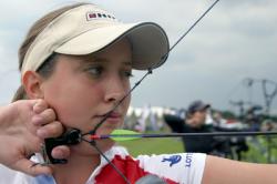 Fans start to cheer louder as one of their fellow countrywoman is taking the field today. Hunt starts first and scores a 10. Her opponent from the USA scores a 9. The Briton then goes on with an 8 and a 9. Van Natta scores 9 and 10 and takes a 1-point lead. Hunt shoots first in the second end. The more experienced American continues with 10-9-10 for 57 points at the half-way mark. The young local archer seems to be unable to hold her nerve and shoots 9-6-7 for an intermediate total of 49 and an 8-point disadvantage. Van Natta adds more pressure to her opponent, shooting a perfect triple 10 to increase her lead to 10 points. Although Hunt comes round a bit shooting 10-10-8, it's not enough to come back (77-87). In the last end Van Natta only needs to control the match, which she does perfectly with 10-8-10. Hunt finishes with 10-9-9 but it is the American who advances to the gold final against Ericsson by 115-105. Hunt will face Goncharova for the bronze.