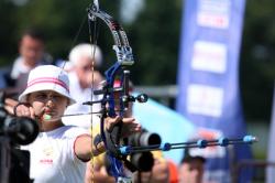 Semi-Final: Ericsson (SWE) vs Goncharova (RUS) The Swedish lady is the first to take the field today. Shooting first on target 1 she scores a 9. Goncharova opens with an 8. Ericsson continues with two 10s and closes the first end with 29 out of a possible 30. Her Russian opponent scores a double 9 and trails by 3 points (26). In the second end, Goncharova starts first, as she is behind, and shoots a 10. Ericsson scores a 9 in a tough wind. Goncharova continues with two 10s, while Ericsson shoots two 9s. Thanks to this perfect end, the Russian recovers and ties at 56. In the third end, both archers shoot two 10s and a 9. They are still tied: 85-85. Ericsson shoots first in the last end (original order, as the match is tied) and scores a perfect 10. Goncharova also with a 10! The penultimate arrow is decisive: the Swede gets another 10, while her opponent scores only a 7. With a final 10, Ericsson clinches the match and will be shooting for the gold later on. Final score: 115-110.