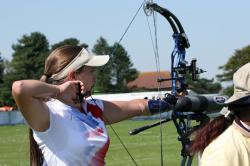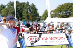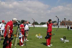 Another medal match for the host nation, this time the bronze final in the Compound Women category! The British team - consisting of Crang, Hunt and Parker - shoot first on target no. 1. They start with 9-10-9 and 28 points. The Turkish - Atici, Erenoglu and Kucukkayalar - open with 8-8-9 and trail by 3 (25-28). They recover thanks to a 10-9-9 series and tie the match at 53. 8-9-8 for the British. The latter continue with a triple 9 (80), while their opponents shoot 7-6-10 (76). The young team of Turkey recover by in the following three arrows and is now trailing 102-105. The margin between the teams goes up again 4 points with six arrows remaining: 161-157 in favour of the local favourites. The Turkish girls now look resignated and they score 8-8-9 (182). The British continue with a triple 9 and increase their lead to 6 points (188). A burst of pride for Atici and team-mates who shoot 10-10-9 with their last three arrows and get a total of 211. The British team shoot 9-8-9 and victory on 214!
