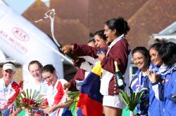 Gold Final: Venezuela vs Indonesia Seeded no. 1 Venezuela is faces no. 2 seed Indonesia in the last match of this year's World Cup Stage 4. The first three arrows of Flores, Guedez and Montes score 8-10-10 (28). The Indonesians also shoot a 28-point series (10-8-10) at this point. Handayani, Heliarti and Threesyadinda continue with 8-9-9 and trail by 2 after the first end (54). Venezuela with 9-9-10 and 56 points so far. Flores and team-mates keep going and with 9-10-9-8-9-9 they double their advantage at the half-way mark after the Asian archers shoot 9-10-9-8-7-9: 111-106. A great example of sportsmanship in the third end with the Indonesian coach telling the first Venezuelian archer to wait before passing the waiting line - it was Indonesia's turn to shoot - thus stopping them from receiving a yellow card from the Judge. In this end Venezuela keeps its 5-point advantage and the score with only six arrows to go is 166-161. Five 9s and a 10 for the Venezuelan girls in the last end are enough to achieve the gold medal. Final score: 221-216.