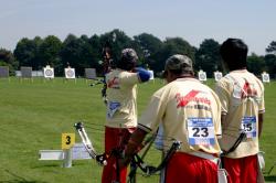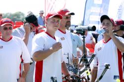 First match of the afternoon between USA and Indonesia. In the semi-finals each team shoots simultaneously. Team USA starts with 9-9-9-10-9-10 (56) and takes a 1-point lead over Indonesia with 9-9-9-9-10-9 (55). Led by 2007 World Indoor Champion and Outdoor Silver medallist Gellenthien, the Americans double their advantage and the score half-way through this match is 113-111. The archers from Indonesia Kuswantoro, Puruhito and Setijawan come back and take the lead before the last six arrows thanks to a great end of 10-10-10-9-10-9 (169). Their opponents Binger, Gellenthien and Wilde L. have 168 points now. Both teams start the last end with a 10 and a 9. Then Indonesia increases their lead to 2 points with a 9 versus an 8 for USA (197-195). Wilde and team-mates recover 1 point with a 10 versus a 9 (206-205). The Indonesians lose everithing when they shoot an 8 with their penultimate arrow and the Americans get a perfect 10: 215-214 in favour of Team USA. The last arrow is a 10 for both teams and it is a victory for USA (225-224)!