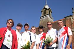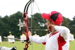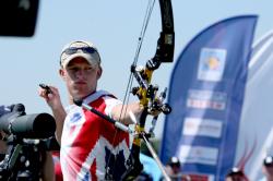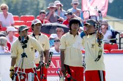 Switzerland takes an early lead in their second semi-final against the local team Great Britain (55-54). The Swiss Hotz gets two low arrows (7 and 6) in the second end and Switzerland loses its advantage. Thanks to Hofer who scores two 10s, however, they are only 2 points behind at the half-way mark (107-109). The British release 8-7-10-10-10-10 in this end. The two teams are very close indeed and Great Britain lets 1 point go shooting 56 with their following six arrows. Switzerland adds 57 points and are behind by only 1 point (164-165). Forbes starts the last end with a 9 and the Swiss Burri scores a 10 to tie the match (174-174). They both continue with another 10 (184-184). Then the second Briton Franklin shoots two perfect 10s and takes back the lead, as his Swiss opponent scores 9 and 8 (204-201). Nothing to do for Hofer who finishes with two strong arrows (10-10), but leaves victory to White and team-mates (10-10 as well). Final score: 224-221.