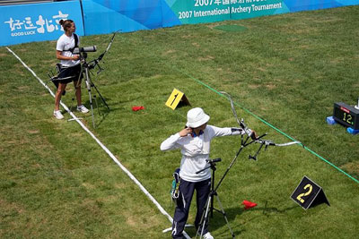 The current number 1 in the world, Natalya ERDYNIYEVA, also suffered from defeat in the second round. The young and talented Russian had nevertheless a heavy task in playing local favourite and World Cup 2006 winner ZHANG Juan Juan. The Russian started with a perfect 30, but then went into trouble shooting 8-9-8 and later on a 6 with her seventh arrow. ZHANG was by far more consistent, shooting an impressive 9-10-10, 9-9-9, 10-8-10, 9-10-10 and tied the best total of the day at 113 points. She defeated ERDYNIYEVA 113-107 and finally gave the Chinese fans a chance to cheer for their own country. The fans have been good sports to every archer in the competition!