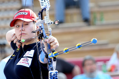 Stage 2 of the World Cup in Varese was my first outdoor tournament, and I was very excited to be there. This was the first step on the way to the final in Dubai! We compound ladies were very fortunate with the competition schedule, since we didn’t have to endure the torrential rain that the men had to during their qualification. As the tournament started, I felt that my form was good, and now I just had to hope for some luck in the eliminations as well. As you all know, to be successful in a tournament you need to be in good form, have good equipment, and have a bit of luck in the eliminations. In the end, I found myself in the gold final together with Jamie Van Natta. It was a final that gave the spectators some extra excitement--parachute jumpers performing a display jump with red, green and white smoke landed next to the finals venue while we were shooting. That was a new experience! During the 12 arrows in the final, I managed to keep my focus on my shooting form, and I managed to win and take home 25 points in the World Cup ranking. So far so good!