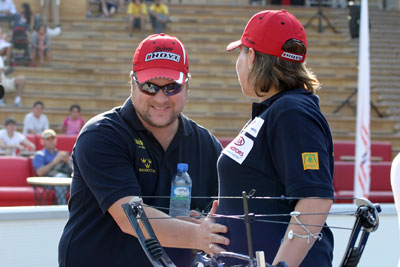 When it was time for the gold medal match, against Sofia, I was totally focused on performing good shots and just following my plan. I had great support from my husband who kept reminding me to keep it simple and just shoot good shots. I must say that the first eleven arrows of that match were as close to perfect as I can come. It was a great feeling. Before my last arrow I heard George announce that I had already clinched the match, which made it a bit difficult to keep my focus on the last arrow. But it was a great feeling to shoot the last arrow knowing that we had reached the goal we set early in January! It was a great experience to share with Mats Inge (and the baby) and also my family who were watching the final on TV at home.