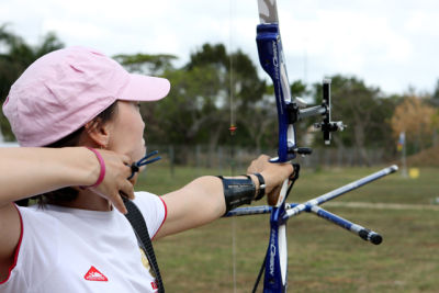 The archers shoot two halves of 36 arrows at a target 70 meters away during qualifications.