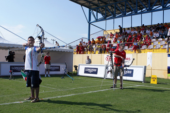 There was only a slight wind this morning, but the occasional gust seemed to be strong enough to affect the archer’s arrows. SICHENIKOVA, making her first appearance on the world scene, missed out on a team bronze medal yesterday. Her opponent, AVITIA, placed 8th at the recent Olympic Games in Beijing, confirming her place among the world’s elite. AVITIA did not start well with an 8-6-9 and was trailing in the match 23-28. She came back in the second end to close the gap to two points 51-53. SICHENIKOVA responded aggressively with 10-9-8 and extend her lead again to 80-76. Although AVITIA finished with 9-9-10 it was too little too late. SICHENIKOVA won the bronze 106-104.