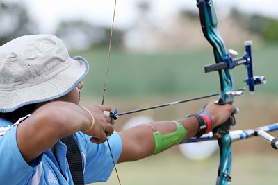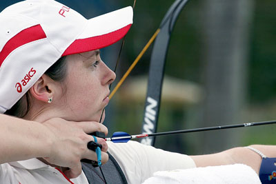 Individual - Recurve Men In the absence of 2008 World Cup winner IM Dong-Hyun (KOR) and any Korean competitors this category seems very open. After the long distances (90 and 70 metres for men), last year’s World Cup finalist Romain GIROUILLE (FRA) was at 1st place with 657 points. Rahul BANERJEE (IND) had the same score but ranked 2nd with twenty-six 10s (vs twenty-eight for GIROUILLE). BANERJEE’s teammate Mangal Sing CHAMPIA was two points behind (655) in 3rd place. Behind the top three athletes, the two Mexicans Juan Rene SERRANO and Luis Eduardo VELEZ SANCHEZ were provisionally 4th and 7th respectively. The Canadian, Crispin DUENAS, was 4th and the Brits Laurence GODFREY and Simon TERRY were 5th and 8th. The morning was marked by the withdrawal from qualification of 2004 Olympic champion Marco GALIAZZO (ITA) because he fell ill and could not continue shooting. Having shot six arrows, he will be able to shoot eliminations as the minimum number of qualifying arrows to be shot to avoid disqualification is one. However, automatically seeded last (no. 48), GALIAZZO will face the no. 17 seed in the 1/32 elimination. If he wins the first match, he will face his teammate TONELLI (no. 16) and if he beats him, he might shoot against the top seeded competitor in the 1/8 round. After 144 arrows, GIROUILLE let 1st place slip, shooting only the 11th highest score at 30 metres. With a final total of 1339 points, the Frenchman ranked 4th, just behind the Mexican SERRANO with the same number of points but more 10s. The top two places were taken by two Indian competitors, BANERJEE (1st with 1348 points) and CHAMPIA (2nd with 1340). Despite shooting the best score at 30m, the Canadian DUENAS lost one rank and finished 5th. The three best British archers ranked very close to one another with GODFREY 6th (personal best at 30m with 356 points), TERRY 7th and WILLS 9th. Between them it was the recent indoor silver medallist DOBROWOLSKI from Poland taking 8th place, shooting his personal best for a FITA Round with 1324 points on the way. Justyna MOSPINEK (POL)