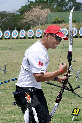 Recurve Men In the first round (1/32 eliminations), the top seeded archers had byes. The others started with their 12-arrow matches. The Italian GALIAZZO—2004 Olympic champion—who was sick the day of qualifications and only shot six arrows in order not to be disqualified, was seeded last (no. 48) and faced No. 17 PEART from Great Britain. In this match, the Briton did not find his marks and trailed 54-57 after six arrows already. After PEART shot a six to open the second half, GALIAZZO finally won the first match easily, 112-104. There was no other real upset in the first round. Except for the no. 35 seed ALVAREZ (COL) who beat the no. 30 REZENDE XAVIER (BRA) by 109-104, all other best ranked competitors won their respective matches. In the 1/16 elimination round, GALIAZZO then faced his fellow countryman TONELLI. The two were still close at the half-way mark, GALIAZZO leading 55-53. However, a 7 at the eighth arrow took all hopes from TONELLI to recover and he lost 105-107. There were two other matches between teammates in the second round. The no. 8 seed and recent indoor world bronze medallist DOBROWOLSKI (POL) beat his fellow countryman GOLY (no. 25), 112-106. The no. 4 SERRANO (MEX) easily defeated (113-108) another Mexican, LASTRA (no. 29).