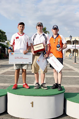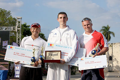 Recurve Men Gold Medal – Crispin DUENAS (CAN) vs Romain GIROUILLE (FRA) The 20-year old Frenchman GIROUILLE won last year's World Cup Stage 2 in Croatia and was bronze medallist at the 2008 Grand Final in Lausanne. He is ranked 5th in the world and was seeded no. 3 in Santo Domingo. Aged 23, DUENAS from Canada finished 39th at the 2008 Olympic Games in Beijing. He is 48th in the current world ranking and was the no. 5 seed in this tournament. In this match for gold, GIROUILLE proved more consistent shooting all his twelve arrows in the yellow ring, scoring only 10s and 9s. He led by two points after the first (28-26) and the second (57-55) ends. His advantage even increased to six points after his opponent DUENAS scored a 6 at his eighth arrow (85-79). The final end would not change the story of this match and GIROUILLE clinched the gold 112-107. Bronze Medal – Marco GALIAZZO (ITA) vs Simon TERRY (GBR) GALIAZZO was the Olympic champion in Athens 2004 and he is now 22nd in the world ranking. Being sick on the qualifications day, he only shot six arrows and was ranked 48th to enter the elimination rounds. To enter the semi-finals, the Italian defeated the no. 17, 16, 1 and 8 seeds, before losing to the no. 5 DUENAS (CAN). TERRY was individual and team silver medallist in the 1992 Olympic Games in Barcelona. Entering the bronze medal match in Santo Domingo, the Briton ranked 16th in the world and he was seeded no. 7 in this World Cup stage. In the semi-final round, he was defeated by no. 3 GIROUILLE (FRA). The two experienced archers were tied after three arrows (27-27). Taking advantage of an 8 by his opponent in the second end, TERRY scored two 10s and a 9 to lead by three points at the half-way mark (56-53). Decision was made and the Briton then kept increasing his lead, 85-81 after nine arrows and finally 113-108 to clinch the bronze medal.