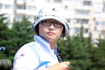 Unsurprisingly, the three Koreans were on top of the women ranking this morning. KWAK (photo) had 683 points. She was 1st at 70 meters with 339 and 2nd at 60 meters with 344 to build a good lead over her opponents. The Olympic bronze medallist YUN Ok-Hee shot 675 points (3rd at 70m with 334 and 4th at 60m with 341). JOO Hyun-Jung had 667 (she was only 9th at 60m with 335). Natalia VALEEVA (ITA) had a difficult start (11th at 70m with 322 points) but she was the best at 60m with 344 points. OUYANG Ruyu (CHN) had the reverse fortune (2nd at 70m and 12th at 60m). Both were tied at a provisional 4th place on 666 points. Two French archers, Berengere SCHUH and Sophie DODEMONT, followed. The 2008 World Cup Final winner, Justyna MOSPINEK (POL) was 9th.