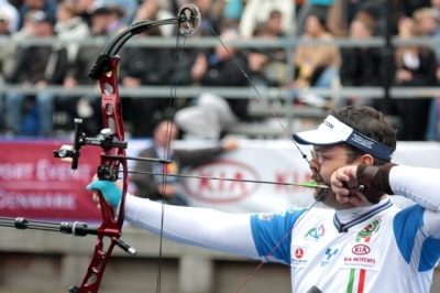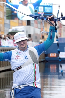GELLENTHIEN opened with an 8. He looked disgusted, probably anticipating that the mistake would cost him the gold. PAGNI shot a 10, followed by a 10 by the American archer. Then PAGNI scored a 9. GELLENTHIEN still had a chance, but he scored “only” a 9 on his last arrow. With a 9 on his final arrow, the Italian clinched the victory by just one point, 115-114. PAGNI is the new World Cup winner in compound!