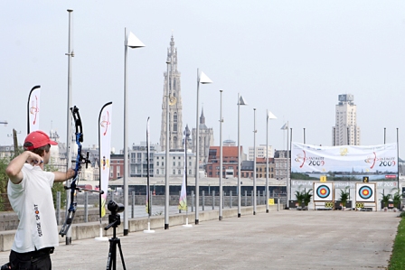 The Belgian National Championships were organized in Antwerp on the 19th and 20th September by the local club Drij Akers Ekeren (DAE) in cooperation with Belgian Archery Team VZW. The competition format was strongly influenced by the direction FITA has given to the World Cup. On Saturday, archers shot a qualification round, individual eliminations and team eliminations until the semifinals, while on Sunday a very nice location was chosen to have the medal matches: archers and spectators gathered on the bank of the river Scheldt, with a spectacular view of the skyline of Antwerp.
