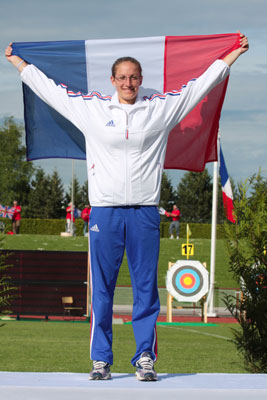 I had two goals in indoor archery: to become world champion and break the world record. In February 2009, I shot 591 points out of a possible 600 in a regional competition. So I shot the score of the world record for the second time in my career. I was a little disappointed to come so close to breaking it. I promised the French journalists that I would try to win the world title and break the record at the same time. I knew I would be the one to beat. It was not going to be easy, since I tend to not shoot so well in qualifications. But this time, I started the World Indoor Championships with a perfect end of 30! I then shot 27 and 28, losing 5 points in three ends. I thought I wouldn't break the world record that day, but Marc cheered me up. I started to shoot one end of 30 after another. After the first series I had a total of 294 points out of 300. I was in 3rd place, very far from the world record. In the second series (6 ends) I scored a perfect total of 180. I shot a 9 in the 7th end (29), then 30 and 30 again before the very last end. I started to think about the world record that was now within my reach. The pressure was huge. I shot a 10, followed by another 10. It was so stressful. On my last arrow I needed a 9 to break the record, and 9 I did! I had reached one of my two goals, but had difficulties concentrating after this. In the semifinal I lost against the future champion WINTER (GER). It was very hard to recover from this defeat. The next day I met Nami HAYAKAWA (JPN) in the final for the bronze medal. I had lost against her in the gold medal final at the previous World Indoor Championships two years before, and wanted to take revenge! I was not very focused but managed to win by just one point, 115-114. I have very good memories from this match, even though I had dreamed to qualify for the final against VALEEVA (ITA). The outdoor season started just three weeks later with the World Cup stage 1 in Santo Domingo (DOM). I was confident and broke several records. I broke the French record with 1361 points out of a possible 1440, set a new French record at 2x70 metres with 675 points at the end of the season. I think I proved my fellow competitors that I can be a dangerous opponent even in outdoor archery. I was 1st in the World Cup ranking before the Final in Copenhagen (DEN), even though I had a bad competition, placing 4th. I was very nervous, it was my first World Cup Final and I had never shot above water before that. European Outdoor Champion 2008