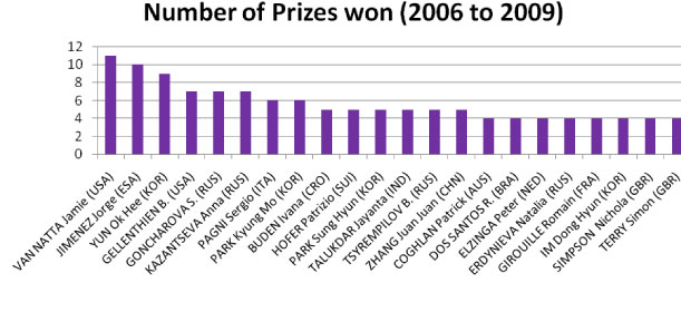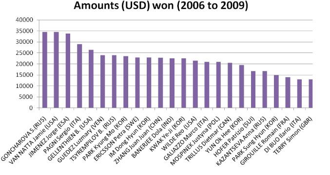 In the World Cup Stages the amounts to be won are USD 2000 for the first place, USD 1000 for the second place. In 2006, the third place was awarded USD 250. This amount was raised to USD 500 in 2007 and for the following years.