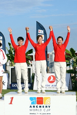 Here in Antalya, Russia shot first and was probably bothered by the wind (8-6-9-9-8-4) to trail China 44-50. However, the Russians had a strong second end at 9-9-8-x10-9-8, but China were just as good with 9-8-8-10-8-10. China led 103-97 halfway through and slowly began gaining more points (10-8-8-8-10-10 to 9-7-7-10-8-9) and clinched the gold medal (x10-10-8-9-10-9 to 10-8-9-9-10-7), 213-200.