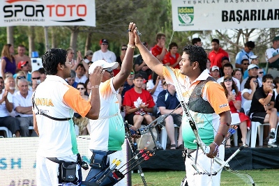 A bad start, a 6, by Vic WUNDERLE caused the USA to trail India 50-54. The Americans recovered closing the deficit in the next end (10-x10-9-9-8-8 to India’s 8-9-9-8-8-9). India was now leading by just a point, 105-104. A third end of 57 (9-9-10-10-x10-9) allowed the Indian archers to increase their lead to 162-157. The USA responded with an end of 57 (9-10-x10-10-9-9), but it was not enough to beat India. BANERJEE, CHAMPIA and TALUKDAR who secured the gold medal with 10-x10-9-9-8-x10, final score 218-214.