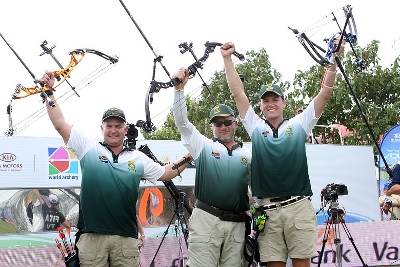 USA (Ben CLELAND, Braden GELLENTHIEN and Rodger WILLET Jr.) took the lead from the start 2-0 (2-1). Both teams shot two hits in the second set. Meaning, the USA were still leading, 3-1. South Africa shot a perfect third end, while the USA had more trouble with the wind and managed only one hit, allowing South Africa to come back 3-3. The South African archers stayed in the yellow in the next set, but this time their performance was watched by the Americans. South Africa was perfect again in the fifth set (for a total of nine hits in a row!) to win two more set points and lead 6-4. Both teams shot only one hit in the sixth set, which meant victory 7-5 for the South Africans. It’s the first ever gold medal at this level for this team! Congratulations to Nico BENADE, Seppie CILLIERS and Riaan CROWTHER!
